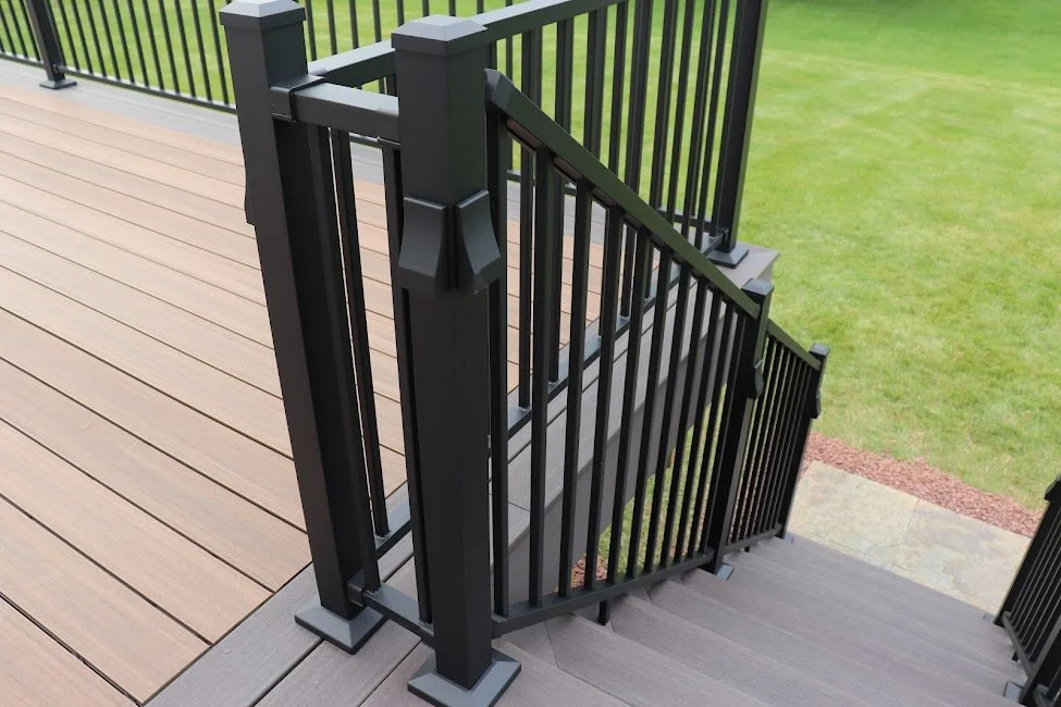 Close-up view of a black metal outdoor staircase with a safety railing and a wooden deck floor, leading down to a grassy yard.