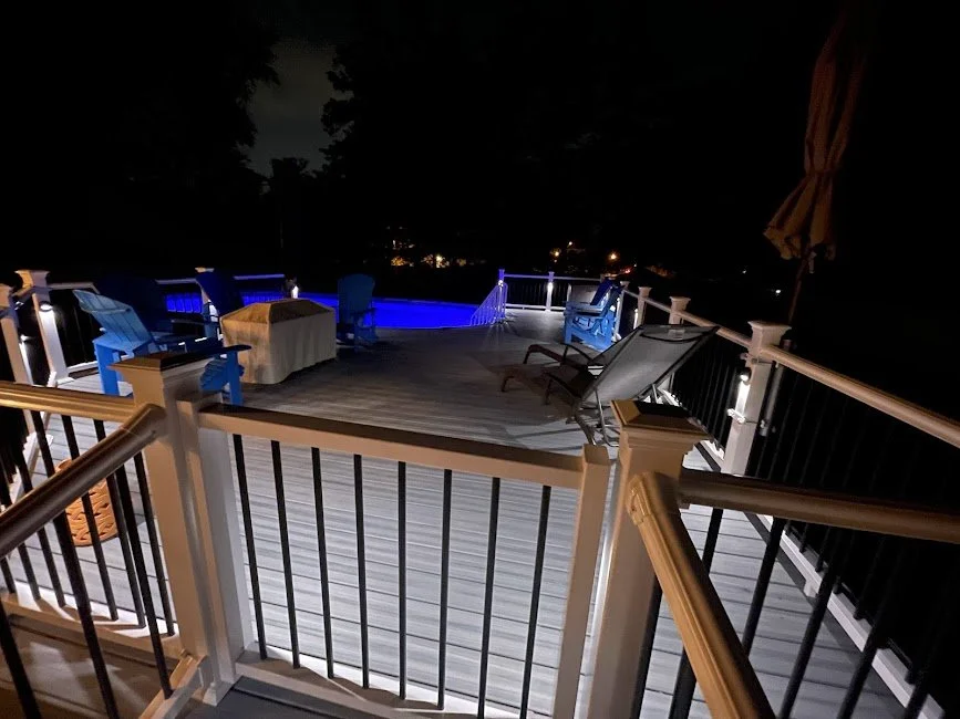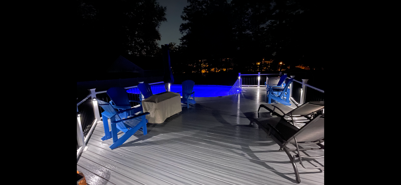 Night view of a lit outdoor deck with a swimming pool, lounge chairs, and umbrellas.