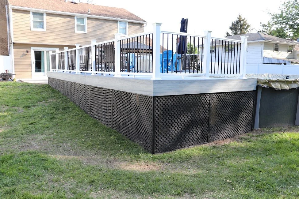 A raised backyard deck with white railing and black lattice skirting, attached to a beige house with siding, in a grassy yard with neighboring houses and trees in the background.